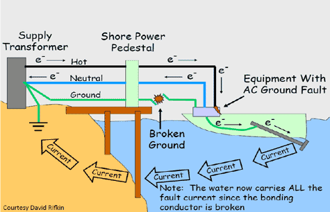 - NEVER dive on your boat to work on underwater fittings when it is plugged in to shore power, even in saltwater.