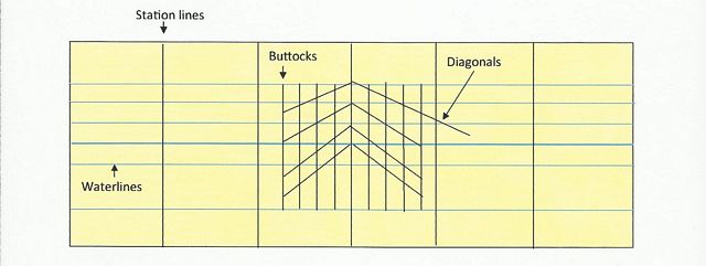 Keep in mind that different designs will have diagonals in different places. Some builders like to put the diagonals in after the shape of the frame has been drawn in. Every diagonal will hit an intersection of a buttock and waterline-some close by as in this drawing and some several feet away from the station line.