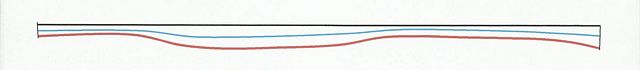 Nearly all keels will taper. Not only that, on the plans the designer will have his widest thickness and the keel rabbet. And if there is a lead ballast, he will have the bottom lines for it right there with the keel lines. This is a typical keel lines plan. I've exaggerated the spacing of the lines to make them visible. The black line is the centerline; the blue line is the bottom of the keel and ballast; the red line is the top of keel. The keel rabbet for planks is so close to the red