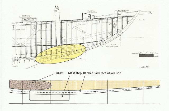 The second area of the stem/keel connection is the place where the stem really ends, meeting with the keel and ballast. Often this area is just under the mast, in a ketch or cutter. So let's go back to Landfall for an illustration.