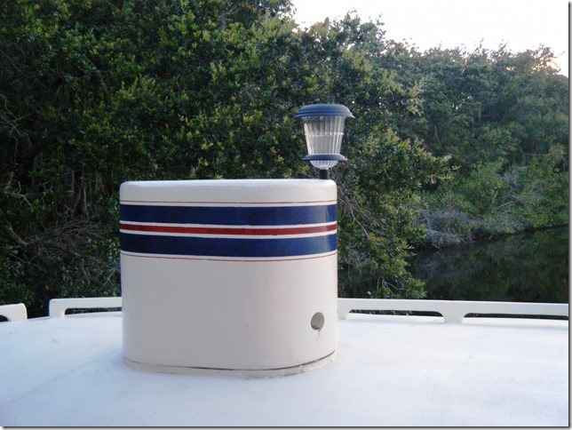 This one I will take credit for because I've never seen anything about this from any of the rest of you. It's probably the most brilliant idea to come along in years, maybe ever. Everyone knows that running lights are a pain in the butt. The front red and green ones sometimes work but the white one never does. For our size boats it has to be higher and behind the front ones and visible through 360 degrees. We end up with a light on a stick that goes in a hole with power that never works or one with batteries. Well, check this out. A solar power yard light. I looked around and found one that was extra bright and stays lit for 13 hours.