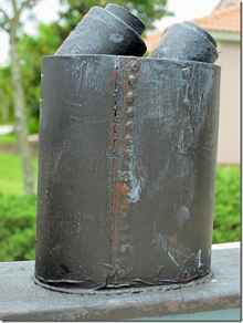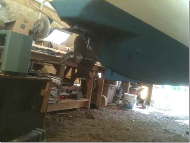 This is a good shot of the outboard motor lower unit that drives the boat. I can't believe that none of you have done this, it's so simple. You use the gear shift, thrust bearing and gears in the unit and all you need to do is couple a motor to the impute shaft that's sticking out the top. Don't ask about that through hull hole you see here, it's a failed attempt to get rid of the exhaust heat.