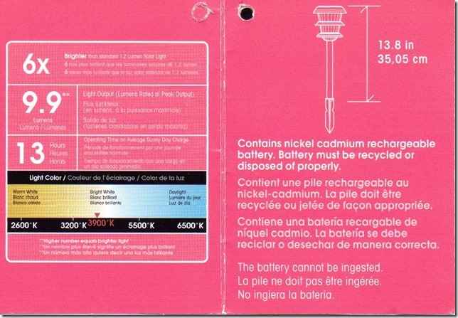 This is the label from the solar light I put on my stack for a running/ anchor light. It really is bright and does last all night.