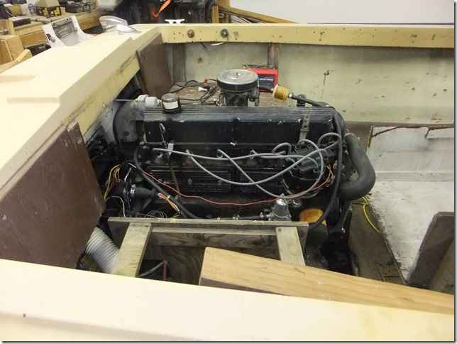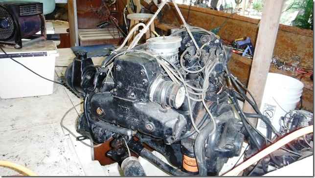 Here's the motor from that big old ugly Sea Ray hanging in the air. It took Howard about a day to break it loose, pull it up, replace the starter and all the fluids and put it back in. I'd still be standing there wondering if I should even try doing it. With Howard it's best to just stand back and out of his way.