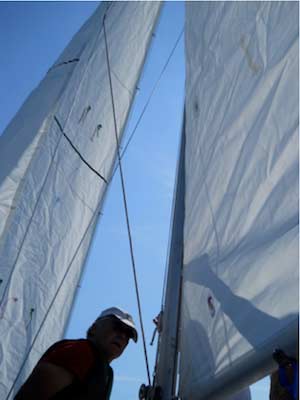The lobster pot field had to be navigated very precisely. In the mouth of the harbor, the wind lessened slightly, but changed direction and began to curl into my cockpit from a different angle and catch under my sail. A sharp gust of wind lifted the sail and deposited it over my head! I pawed the sail off of my head, knocking my glasses off in the process. I blurrily finished navigating that field without further incident, but wondered then and there what might be a way to better manage a dropped sail so this situation would not be repeated.