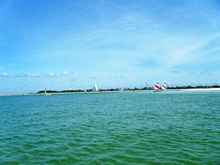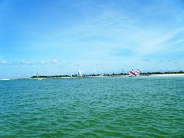 We had so much fun sailing at Ft DeSoto two weeks ago that we did it again and after hearing how great this place is some new boats came along. You can tell from these pictures why this area has been named one of the best beaches in the country. I'll comment on a couple of these; Franks big tri performed well but us mono guys still think it's just a skinny boat with training wheels. Michael had a new little boat he said was a skerry, I think. It was pretty but a little slow for him and it rolled him out into the water during a jibe and the big boat wakes.