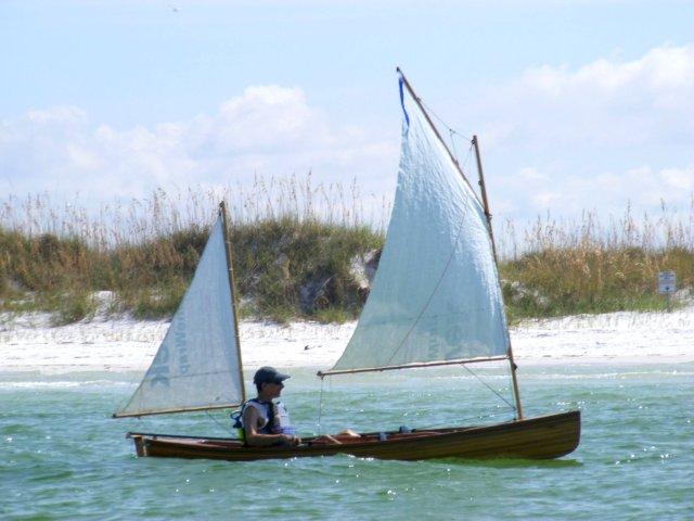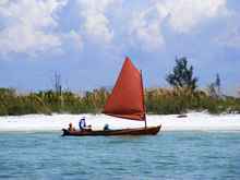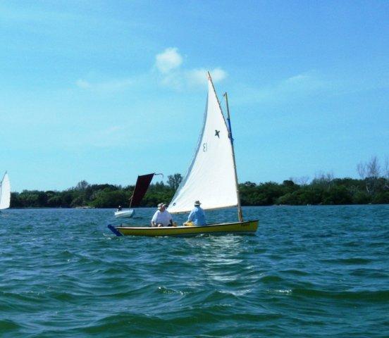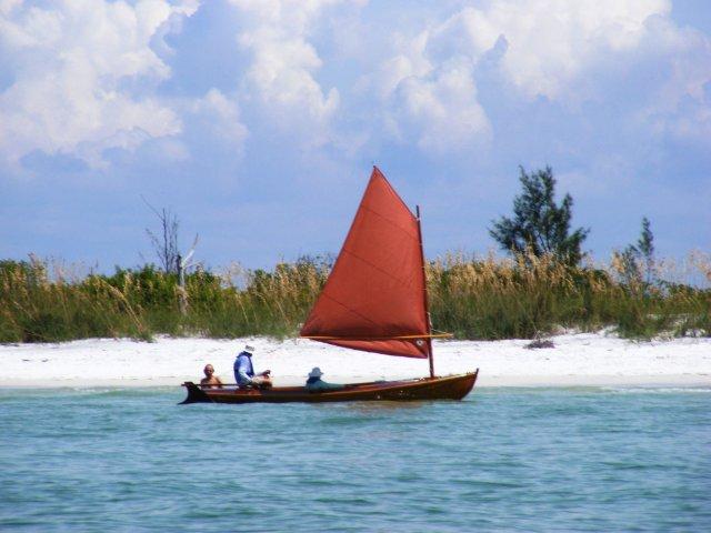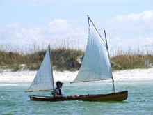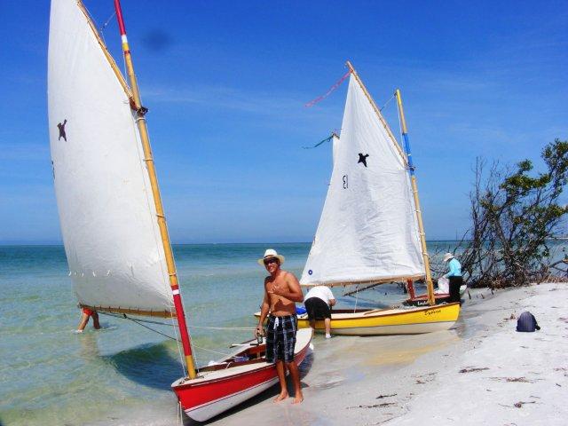 Crazy Steve had his tiny ketch wound up and moving right along. He answered the question once and for all; What's the fastest sailboat in the world for going to weather with absolutely no wind and no oars? These two melonseeds are laying on their sides to get their centerboards unstuck. The beach was not sand but crushed shell that really jammed up our boards. Since they float on their sides we just pulled them over, popped the plug on top of the cap and pushed them down with the stick made for just this.