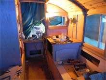 In a small space, areas need to do double duty. Here's a messy picture of what will be the kitchenette. As I mentioned before it will also serve as part of the bathroom. Featuring a small sink (not yet in place) and a camp stove on the 36" X 38" counter. A cooler will sit on the floor under the rear deck (12 volt with solar panel?). This arrangement is simple but flexible as one can also cook on deck or on shore. Removable water jugs under the counter with air pressure from a foot pump is our simple plumbing, the water then draining into another jug and later emptied where appropriate. I mentioned "filler boards to make up a bed", these are actually a folding dinning/card table and two folding benches. They expand the seating area when friends come by and let Dianne and I move on deck or shore to dine. The benches are the steps into the boat, while the table folds away and is a storage shelf under the front deck. This is how I plan to be comfortable and do all that's needed in a small House/Camp/Shanty Boat.