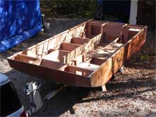 Construction is kept simple by using "frame" and "stitch and glue" where they are most advantageous. Most of the boat is built on two benches in long flat panels. These panels either lock together "egg carton" style or are glued and screwed with epoxy and deck screws. The curved ply for the bow is easily bent into place.