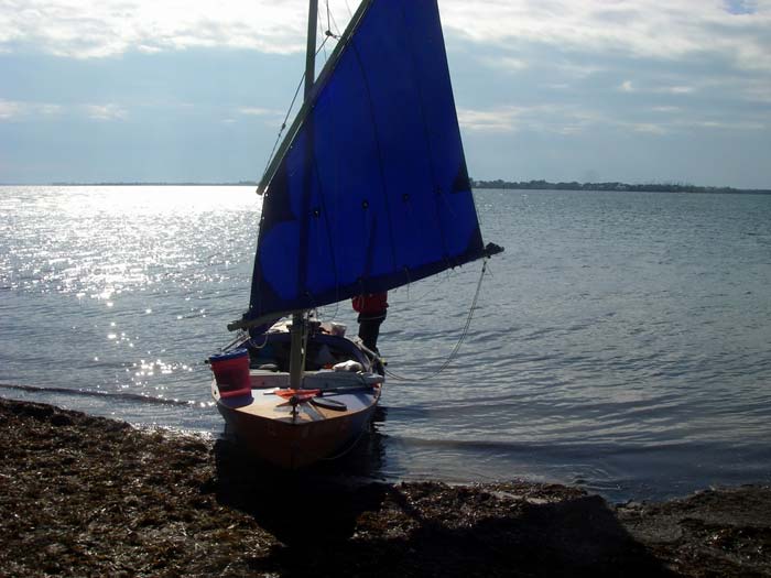 Around 6, the breeze seemed a more manageable velocity and shortly we were stirring and getting ready, as Chuck waded around the boat stowing the tent and restepping the masts. The plan was to take turns rowing to deep water to warm up and then sail on our way. Around 7, we were off. Rowing wasn't necessary for long as the brisk northeasterly had us moving toward Boca Grande Inlet under a single-reefed main. Charlotte Harbor always seems to be waiting with something special for me, and this year was no different. In 2012 a contrary wind and tide produced waves that nearly broached Oaracle. This year there was a negligible tide, but the strong wind had kicked up a healthy following sea that shoved us toward Cayo Costa. The white knuckle ride lasted across the inlet and up the outside of Cayo Costa until the shoals and islands offered some shelter.