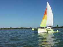 Chuck had called his wife, Sandra, who gave us the weather forecast for the day: light to moderate south easterlies (headwinds on this part of the course) shifting to southwest in the afternoon and then westerly sometime at night. We found the light south easterlies as we hit the Gulf, but they quickly went very light and fluky. We tried to tack south, but mostly bounced around for about 45 minutes, and then a southwesterly filled it and we began to make steady progress, although there was a moderate chop. A couple dollops came aboard but overall the dryness of the Walkabout was impressive. We didn't bother to put up the dodger for extra protection. Pavilion Key was soon past and Chuck used his GPS to calculate we could make it almost to Northwest Cape Sable before we would have to tack. I came to think of this part of the trip as "thump, splash, repeat" as we worked through the chop. It wasn't lonely. Coastie and ClamCounter on their Hobie went by, and Will and Amber Nye (ZeroTheHero and Green Mountain Girl) provided a spectacular view as they went by in the afternoon on their Vanguard Nomad 17 sloop, both pointing higher and footing faster. (Yes, I love unstayed rigs, but going to windward a properly tuned, stayed rig is almost always better.) And most of the day we could see Stan Hanson (Etchemin) and Bob Bradford (NiteNavigator) behind us in their Sea Pearl tri. This would also be one of the rare days in an EC when no reef was needed.