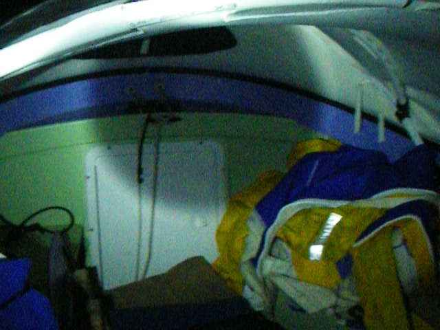 Night shot: A picture of our dodger, lit by flashlight, on Tuesday night as the wind eased then died. We appreciated having a covered spot where the off watch could stretch out and sleep. We got enough rest this night that once the wind picked up, we were able to finish without having to take any more breaks for sleep.