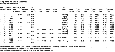 Ernest Walter Blockside authored "Ships' Boats: Their Qualities, Construction, Equipment, and Launching Appliances " in London in 1920. He describes the construction and outfitting of lifeboats. My googling lead me to this book, and I purchased a Nabu Public Domain Reprint. The information in the table is a compilation from 3 Tables and 8 Figures on 7 separate pages. I had to convert hundredweights and calculate a couple of dimensions that were missing from the figures. In doing so I discovered that the Working (Standing) Lug drawings in Figures 209 and 210 are transposed. In order to check the dimensions I used this Sail Area Calculator.