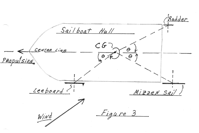 Example: The winds are blowing at 10 mph, and the Sailboat is cruising along on beam reach. The Leeboard is generating a lateral force of 24 Lbs, the Mizzen Sail is generating a lateral force of 12 Lbs, and the Rudder is generating a lateral force of 6 Lbs. See Figure 3, for an illustration.