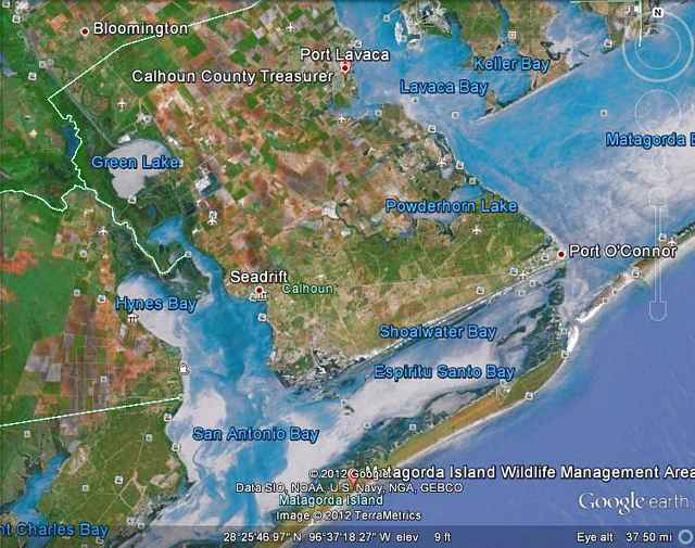Chris and John began Saturday morning by taking care of shuttling our vehicles and trailers from Seadrift to Chuck Leinweber's house in Magnolia Beach for the final take-out. While they were gone, Rosa and I went to the small local grocery store for some provisioning. Upon returning to the boat, I was dismayed to see a swarm of fire ants traversing our dock line and into the cockpit where they were munching on all the little crumbs from our Texas200 lunches that had fallen under the cedar grating of the cockpit sole. I tried flushing them out with buckets of water to no avail. We poured lighter fluid around the dock cleat and set it on fire. This ebbed the flow of fire ants temporarily while I went back to the store to buy a can of Raid. After ridding ourselves of the little beasts, we were ready to go. Our sail was still double reefed from the Texas200, so Chris shook out the reefs while we were still at the dock, fully expecting to have to put them back in before the day was done. John was having issues with a faulty spark plug for his outboard but was able to get a replacement for it from the local bait shop. The two boats finally motored out of Seadrift about 10:30 a. m.