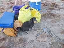 We talked about Major on the way back to the boat. He's an old dog, almost 11, and we agreed that he couldn't handle the heat and long walks like he did when he was younger. However, upon arriving back at camp, he hopped out of the backpack as full of energy as a young pup. This just reinforces my belief that he is a dishonest dog. He has lied to us before about things, such as pretending to Chris that he is starving and begging for food when I just fed him an hour previously. It was evident his behavior on the hike had nothing to do with being old but was a reflection of his bad attitude about hiking instead of hanging around camp. I got my fishing rod out and tried unsuccessfully to catch us some lunch. I was fishing with lures, something I have never tried before, and I still haven't quite got the hang of it. Major enjoyed playing in the shallow water while I fished and Chris relaxed in the shade at the picnic table.
