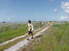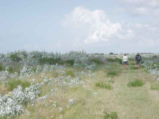 The trail we were on came to a dead end so we backtracked to another trail that had intersected it previously. We went down that trail and it ended at a deer blind. Chris (with Major attached) and John climbed the ladder up into the blind but could not see where another trail leading to the beach would be. We started walking through the waist-high brush directly toward the lighthouse but after I started squeaking out my concerns about rattlesnakes and Lyme ticks, we headed back to the trail. John, Desiree and David decided they would return to their boat and prepare to leave for Magnolia Beach. Chris and I wanted to take one last attempt at finding the beach trail so we tried the only path we hadn't been down, and of course, it quickly became apparent that it was the correct one. Feeling pressed for time, we returned to the boat, saving our beach trip for another day.