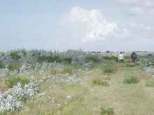 After coffee the next morning, we packed a few soft drinks in a backpack and a bottle of water and dish for Major. John, Desiree and David got a head start on the trail while we visited with the local sailor who had just baked a cake and offered us a slice. We asked if he had hiked over to the beach and he responded, "No, it's too far and too hot." Not to be deterred, we took off down the trail and caught up with our friends who were looking at a posted map of the area. It seemed like a rather simple trail system and we set a brisk pace toward our goal. The trail was a gravel path, but Major kept getting stickers in his paws and couldn't walk. When we tried to help him, he would turn into a 500 pound gorilla while we held him down to take them out. We stopped a few times to give him water as he was panting pretty heavily. Suddenly a large jackrabbit appeared on the trail. In an abrupt burst of energy and forgetting his sore paws or exhaustion, Major raced after the rabbit. After giving chase to it for about 15 seconds, the rabbit escaped into the brush and Major resumed his position in the rear, limping along in a dejected manner. Shortly after the rabbit episode, he stopped walking altogether and just stood there. When we called him to catch up to us, he started walking backward. Seeing that he was too tired to continue, we opened up the backpack and Chris carried him papoose-style for the remainder of the hike.