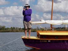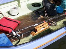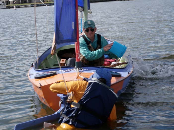 We had no trouble scooping a person into the boat. We did it four times – each of us righted the boat twice, once on each side. Every time the boat ended up with water well below the top of the daggerboard case. We are not sure how having a lot more gear will affect this. On the one hand, much of our gear will be light stuff in dry bags stowed under the deck forward and that may displace some water – but some will be heavy and that will cause the boat to sit lower in the water and scoop up more. Since we found the boat so easy to reboard, we may just give up on the scoop and right the boat without anyone in it. Here is our third test: