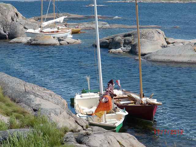 Day 6. Next to the last day! Clear. Sunny. This was planned to be a rest day. No breaking camp. Just a lunch sail. Off we went due north from 534. Most of the boats went east of the island just above 534. Raider went between two islands, through water less than 2 feet deep, bounced off a few rocks, up popped the leeboards and the rudder blade. Had to row when the wind died for a little while. Joined up and sailed into the good sized industrial town of Fobbey with a huge marina. Big restaurant where we pushed the tables together for all 20 of us to sit.