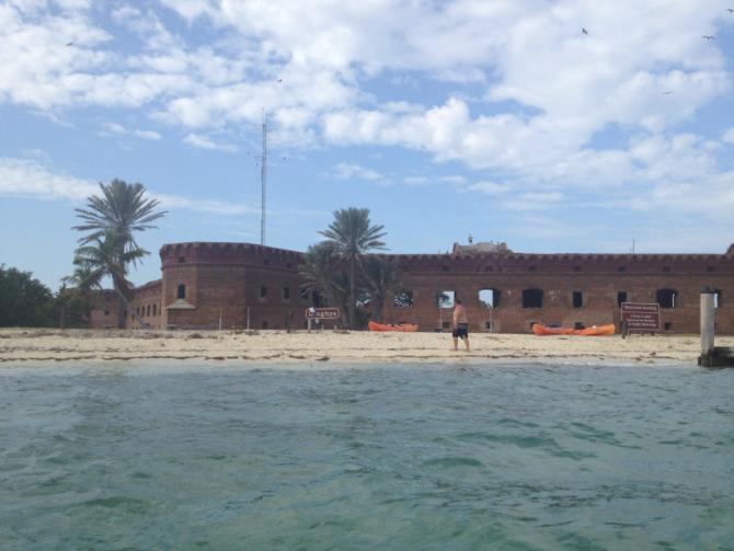 We had both my Garmin 76 Cx and Kevin's more basic GPS. Either set had plenty of information for this kind of trip. We just kept adjusting for tide and observed the set on passing crab pots and the plot on the little screen. By 12:30 pm we had made landfall on Fort Jefferson, the lighthouse on Loggerhead Key, then east and Hospital Keys. By 1:30 pm we anchored off the dinghy beach in the Garden Key anchorage.