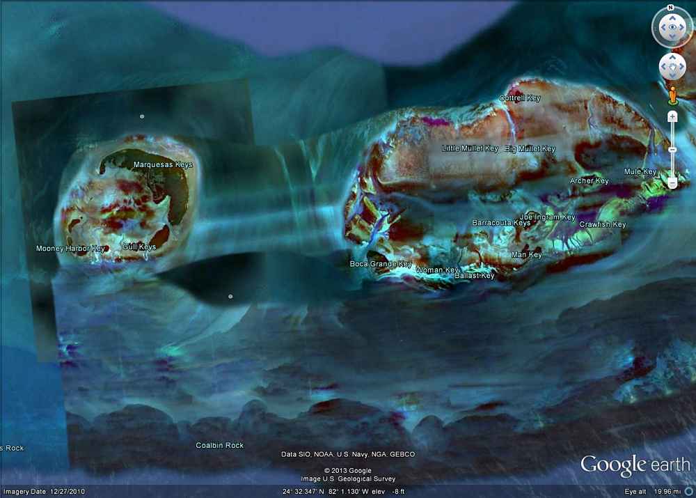 We entered Boca Grande Channel in a light easterly with deceptive visibility. We approached Gull Rocks and were within a mile and a quarter of the Marquesas without seeing any sign of them although they are quite large and high. Then the fog lifted and there was land everywhere to the north of us. There are random brain coral bricks about a half-mile off the Marquesas, so it is good to keep a sharp lookout and maintain some offing. There is a grand archipelago of mangrove islands surrounding a large well protected Mooney Harbor. We were warned about mosquitoes but there is no fresh water, so no bugs. In fact, in two trips we've found no bugs anywhere.