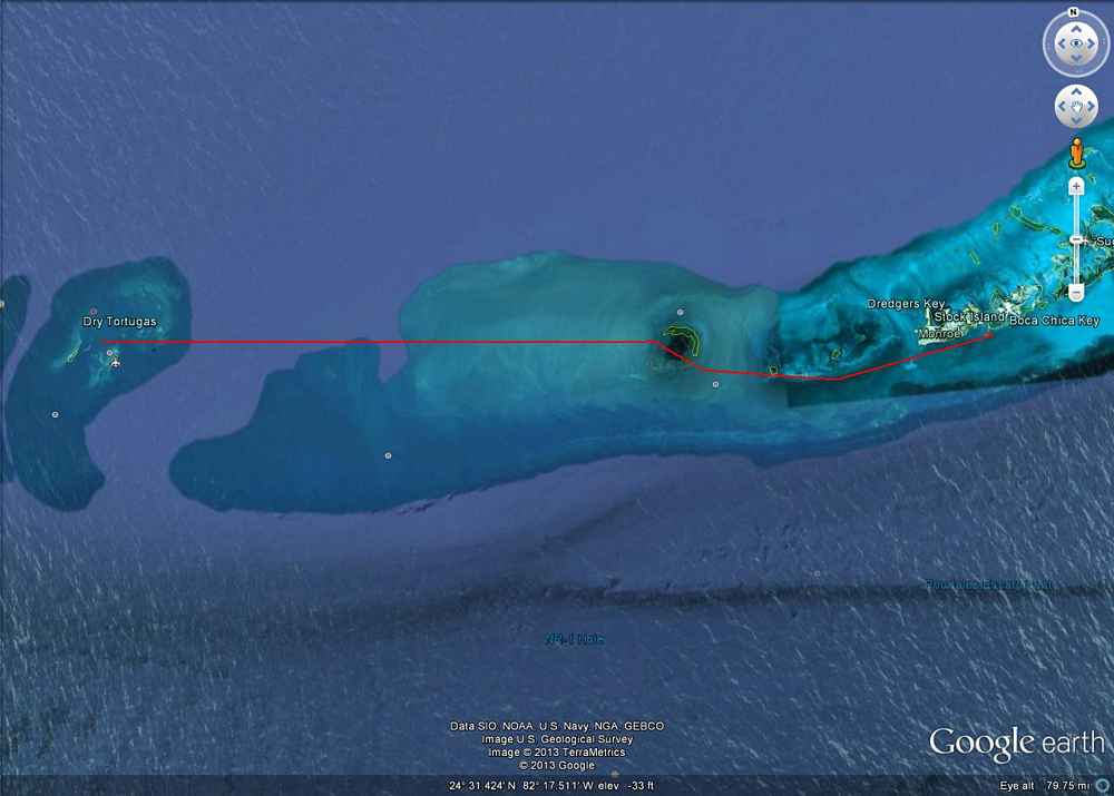 I drove to Kevin's house on Friday night so we could make an early start the next morning. We left Frederick, Md., at 5:00 am Saturday December 8, to beat the traffic around Washington D. C. We drove south 1,240 miles pretty much non-stop and arrived at Oceangate Marina at 2:00 am Saturday and grabbed some sleep in the boat. After waking we settled with the marina and had a quick breakfast. The television told us that the weather window was good for another go, so, before 9:00 am Sunday, we launched and were off. The harbormaster was a little skeptical about the passage but when we told him about the February trip, he just shrugged and said "Timing is everything". He's right. We were under pressure of time this vacation and had planned for a figure-eight loop around the lower keys, but, really, both of us were primed to go do the Dry Tortugas passage again. As long as we had the weather we really wanted to repeat our February passage.