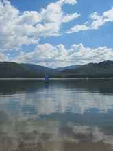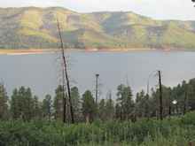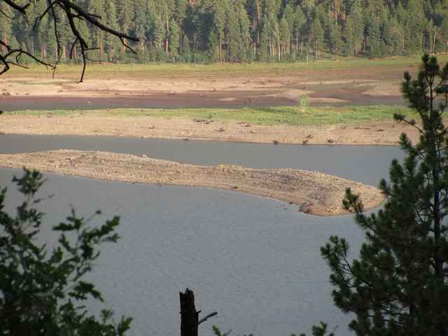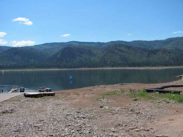 Last year we were able to launch from a little beach at a forest service day use area. That was a fairy tale experience. We had big tall trees there with lots of shade and our own picnic table for the time we were there. This year we saw that the lake level was way down but drove to the day use area to check it out anyway. We parked at the picnic table by the spot we launched from before and the water was about 100 yards out from the little beach this time. A puddle duck is not a heavy boat, but I was not going to haul it that far through all the mud and muck to get to the water. So we drove back to the marina and launched from the beach by the end of the boat ramp. We found a picnic table under a shelter not too far away from the boat ramp to eat our lunch at, but it was not nearly as nice as the spot we used in the day use area last year.