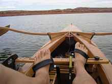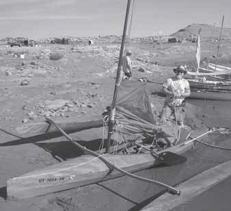 We met Jeff Blunck from Fort Collins, Colorado, on the way in. He was on his way out to launch his Sneakeasy at Bullfrog, it was too long for the rough and ready beach launch at Stanton Creek. He told us how to find the other messabouters, but we did not listen very well and we would still be driving around looking if Chuck had not hauled out the GPS and the camp coordinates and got us pointed in the right direction. Around the last corner and the pirate flag of wild man Bruce Anderson appeared. Out in the little bay below the camp were Kellan Hatch and his son Elliot in their trimaran, Curious, powered by the Hobie Mirage Drive. Dave and Anita Hahn of Delta, Utah (Dave had the idea for this messabout) sailed and rowed towards us in their dinghy.