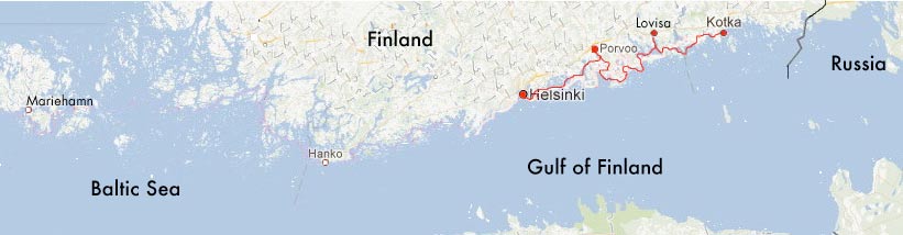 Arrived last night  from Pennsylvania via Toronto, Frankfurt, Helsinki by plane and Kotka by bus. Launched the boat on a borrowed trailer in Kotka’s main harbor, and motored up to a small creek north of Kotka for the night. It is windy, choppy and cold, and will take several days to overcome jet lag, get my sea legs and warm up.