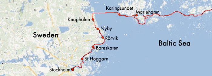 Up and away this morning at six. Only sprinkles during the night. Still a sky full of rain clouds but little glimmers of bright blue up ahead. The sea was doable and though very cold I was dealing with it. A little after 11:00 I banged up another prop on a submerged rock while being distracted by one of the large cruise ships that ply the Swedish Archipelago. I described this run down to Stockholm earlier as a series of protected rivers and canals. Wrong. I’ve been informed that what I’m sailing is still the Baltic Sea, peppered with hundreds of small islands along Sweden’s East coast.