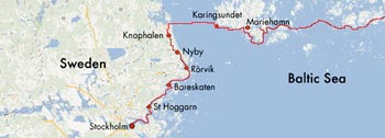 Really good day today- sailed right through the middle of Stockholm - what a city - big, not particularly pretty but vibrant. I happened upon the populous on their way to work at 8:30 am, and they were all on bicycles. I watched slack-jawed as many hundreds streamed over a small bridge in the middle of the city looking for all the world like a Tour de France pelaton. Sun shone today, a little rain, but not so cold and smooth water. Am still in the archipelago, hoping to have a good day tomorrow and maybe get close to the entrance of the Gota Canal. Went through my first lock today, in the middle of Stockholm. Didn’t even know it was a lock until I was already in it. Swedish for lock is “sluss”. I can remember that.