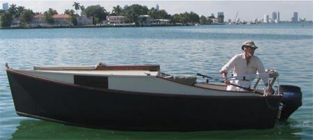 Kiss of the Wolf* (KOTW) was built in 2008 in a Nazareth PA backyard. She is a fifteen and a half foot, out-board-powered, flat-bottomed skiff in the Sharpy style to lines drawn by boat architect Jim Michalak (AF4b).