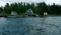 The banks along this bay and along the other waterways leading in to it are dotted with small skiffs pulled up on land clear of the shoreline, sometimes clusters of 15 to 20 boats, but more often just single boats with 40 hp motors hanging off their stern. Not one, however, deigned to be out in this weather. Huge tour ships (Finnlines) pass by though. There are plenty of summer cottages- the ubiquitous barn red with white trim. I’d say there is one cottage to every ten boats.