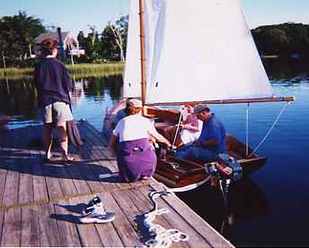 In 1992 I started building a Haven 12 1/2. You can see my launch day. To me, at that time in my life, the Haven was the personification of what a small wooden boat should be: smooth lines, lots of bronze fittings, varnished mahogany, gaff rig - it was beautiful. I sail up on Cape Cod where shallow water and tidal issues dictate where and when you can sail, so the Haven's 18" draft made it fairly easy to get in and out of the water, however, setting the mast etc was becoming a bear.
