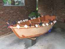 All that was left was some detail work. I leathered my oars and the sprit and made a couple of belaying pins using simple wooden dowels. I cut out the hole in the mast partner and then lined it with leather. I bought a post-hole digger handle for a tiller. I had to flatten the end of it and attach a couple of pieces of plywood so that it would fit over the rudder. It works perfectly. Next I attached my hardware: an eye bolt at the bow, 2 straps on the mast partner for the halyard and snotter, a wooden thumb cleat on the mast for the snotter, a cleat at the base of the mast for a downhaul, two sets of brass oar locks, and the pintles, gudgeons, and a hold-down clip for the rudder. Then I set up my running rigging. Lastly, I made a rack that fits over the rails of the boat to hold the spars, oars and tiller for transport. The boat was now ready to sail!