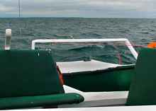 View of dinghy from cockpit on lovely moderate-wind day. |