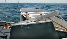 As time went on, I began to worry about the storage of the dinghy on the deck. I had a good place for it to fit upside down on the foredeck until I raised a part of the forward cabin to get more headroom for the head. That on-deck space was lost. On top, the cabin was too high to clear the boom. Besides, it was blocking the view forward. I could just barely store the Tortoise upside down bridging two of the forward hulls, but it then blocked one side entirely and needed a very strong person to flip it and launch it.
