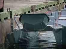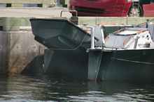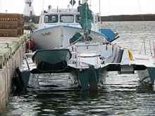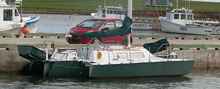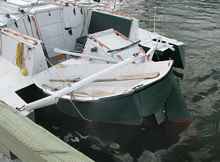 Positioned over the open space between the hulls at the stern, it is right at the ideal place for launching and boarding. It is easy to sit on the deck between the hulls and step directly into the center of the dinghy. Since it stores upright, it is ready to board as soon as it hits the water. Initially, I tried a cloth cover, but that was too much trouble and came off, so now I have painted the interior white to protect the Epoxy from the sun and added a drain plug that I remove during storage to allow any rainwater to drain out. After a bad experience when the dinghy almost got lost in heavy seas, a rope can now go under the center to adds an extra measure of security and lift it higher out of the water.