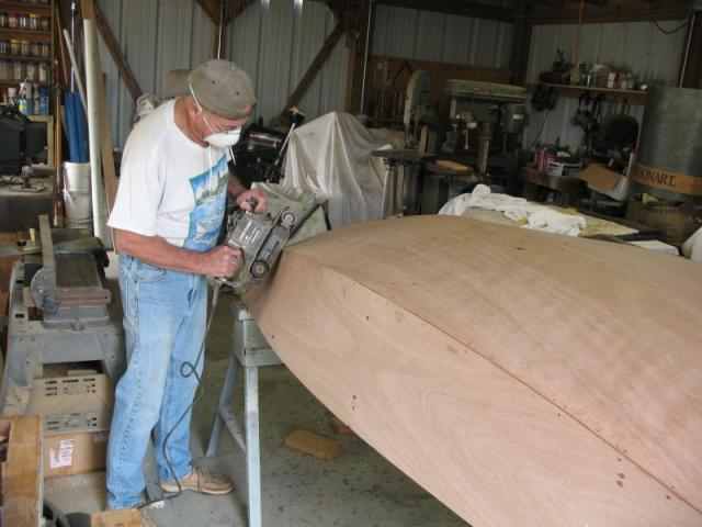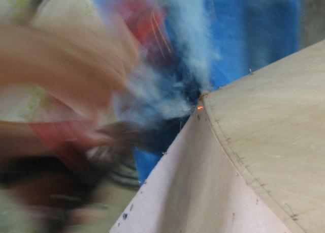 Next, the boat gets flipped, all the wires are pulled and the chines get rounded and taped. Probably a short day.
