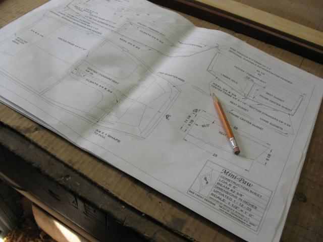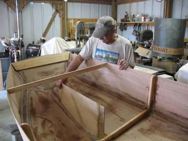I'm building a storage compartment in bow of dinghy, which isn't on plans, so every thing has to be built "in place". After much measuring, re-leveling, re squaring, etc, a pattern was made from heavy cardboard for the cross ways (thwartships) bulkhead. |