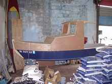 Primer and a finish coat of the paint was put over the not yet smooth surface of the exterior of the boat. I will have to go back at a later time and do a lot of sanding with additional priming and a couple more coats of finish paint. It's acceptable now with it's 50 foot workboat finish.