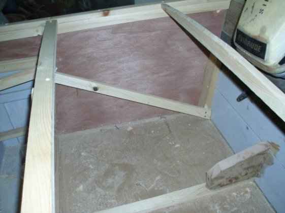 The skiff had external chine logs. I cut them back 18 inches and spliced new logs for the aft section. Likewise I extended the rails back to the new transom. Carefully the new pieces were added for the bottom and the sides of the new aft section. I then added a lamination of 2 x 6 pieces to make a new strong transom. The transom was braced with a knee in the bottom and I put braces from the bottom corner at the sides reaching to the top corner of the original transom. It resulted in a very strong addition to the boat which could easily handle the 9.9 Evinrude.