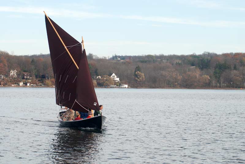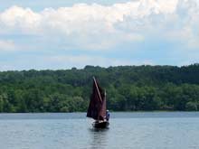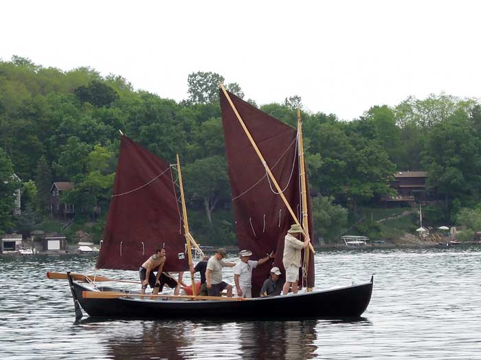 My son and I took two willing but inexperienced sailors with us in 20 kn winds a few weeks later. Running downwind from the launch at Tremain park under mizzen and jib, we reached the south end of the lake , and throwing caution literally to the wind, we deployed the main and turned into a beam reach, "cracking on to make all sneer". Within about 30 seconds we had carried away the peak outhaul cleat on the mainsail . So we struck the main and carried on with jib and mizzen, roaring across the 3 foot waves and reassuring the squeakers. No spray, no untoward or awkward behavior, just an exhilarating day on the water. The hull tracks well with little leeway (centerboard down) and the rudder is very light in the hand and turns the boat quickly. I don't have any photos of this, but lots of people took them from other boats; anyone out there have some to share?