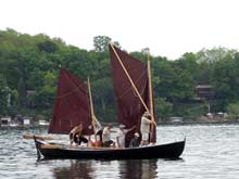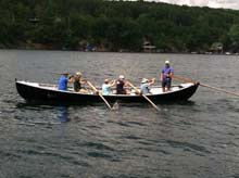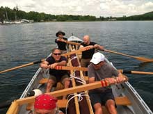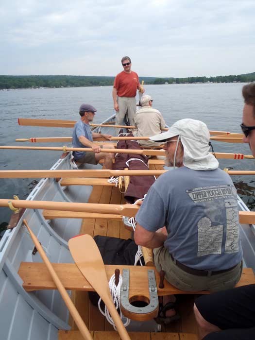We set out about 10 against a steady 6-8 kn head wind. The Waterdog served as support for snacks, rest, bathrooms, etc. We had 8 crew, and rotated two off in the Waterdog during the trek. Altogether it took us about 6 hours to row the 18 miles down the lake, making about 3 kn against the wind. We received a warm welcome from the gas engine runabouts when we arrived.