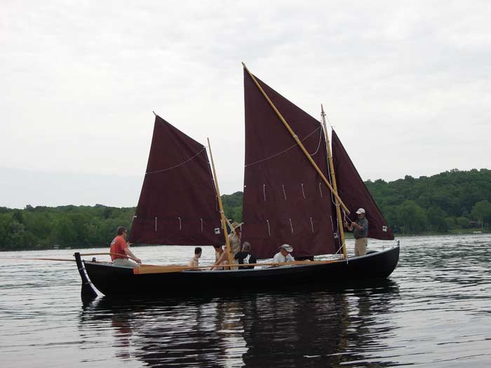 The biggest challenge of this summer turned out to be trying to get enough crew to take the boat out . It can be sailed by three able seamen but more is better. It will move under two paddles (stored along the centerboard trunk) in light airs but needs the rowers to move well into the wind.