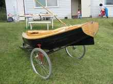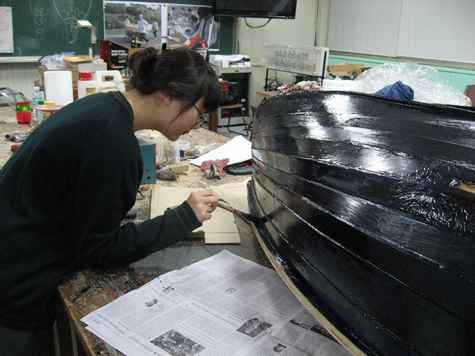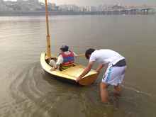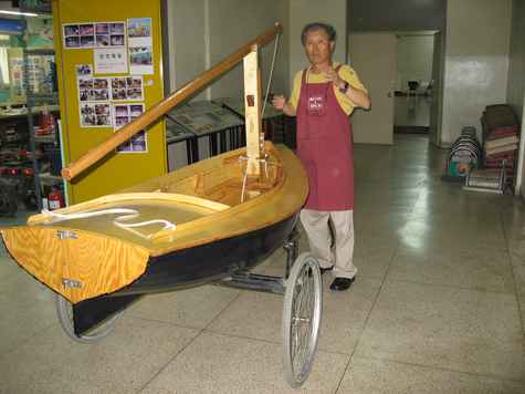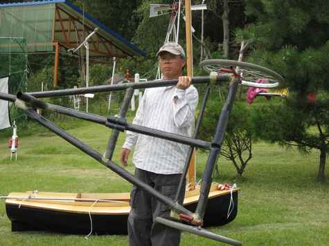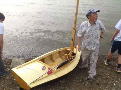 In order to waterproof her, we put glass fiber on vulnerable segments and varnished whole body; this led to her being even heavier. Around this point, it was no longer possible to lift her with one hand though she was still light enough for a yacht.
