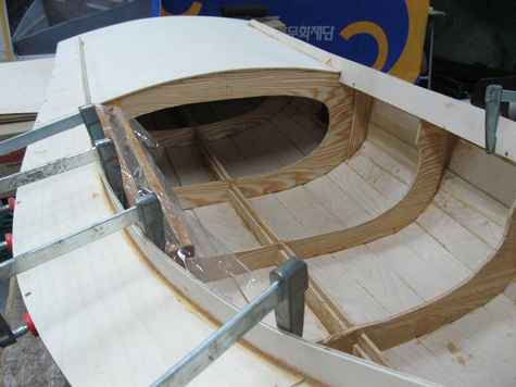 In the meanwhile, we finally succeeded in contacting 'Phil Bolger & Friends Inc.' in September, 2011 at the cost of endless faxing and emailing throughout our summer vacation. We received the plans for Queen Mab in the following month, which was to be our second yacht project: it was so timely that it arrived in Seoul - from far away Massachusetts - just as we finished the previous one. Building Queen Mab took us more than a half year this time.