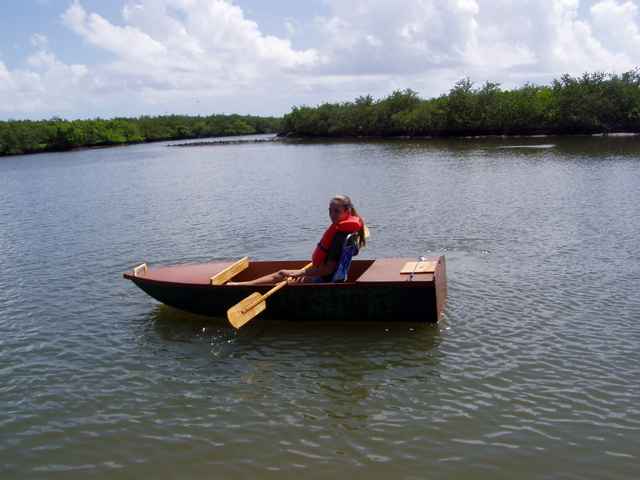 Now we can paint and put "SHOFAT" in the water. The paint was 'DECK STAIN' from LOWES out of the mismatch bin, quite a bargain. I went with a brown deck and a green bottom with swirls on the sides. My first mate likes the paint job.