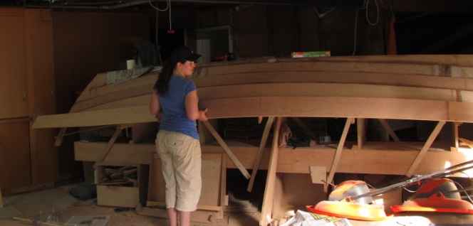 There were two things I did differently from the book. The first is that I did not fibreglass the bottom and garboards. If I had I would have planed down to bare plywood for the next plank land, because I don’t trust gluing a plank to cured epoxy. The second thing I did differently was to build a pattern for each plank using light battens and screws, a technique described in Iain Oughtred’s book Clinker Plywood Boatbuilding Manual. David uses a simpler method that didn’t work so well for this boat. It is critical for a good result that the plank lines are perfect. Unfortunately, I don’t have a photograph showing the use of a pattern. This is my daughter helping me to fit the final plank.